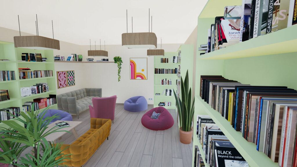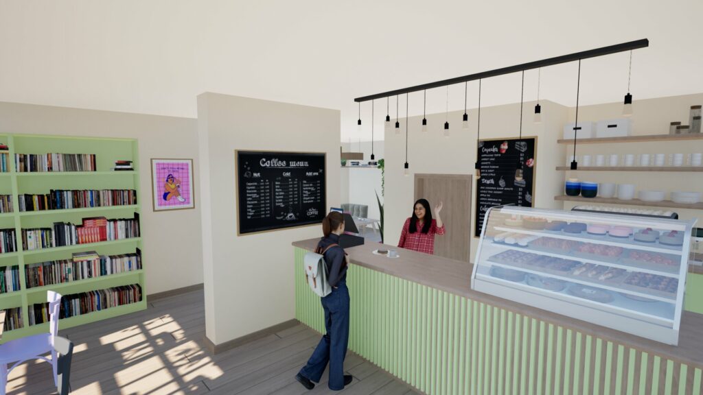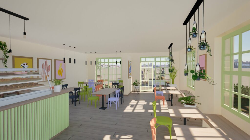 Ich glaube, fast jede Freund*innengruppe hat sich schon mal vorgenommen, ein Café zu eröffnen. Das ist auch an meinen Freundinnen und mir nicht vorbeigegangen. Unser hypothetisches Café ist das Alles-Café. Es soll bunt und voller Pflanzen und Bücher sein und es soll überhaupt alles geben und alle sind willkommen (FckNzs natürlich).Es gibt Gebäck, Workshops und Themen-Abende und eigene Tassen für Stammgäst*innen. Und mit so einem Rendering-Programm kann man diese Vision doch in einer Übung ganz gut umsetzen. Hier ist also ein erster Draft, wie das Alles-Café in meinem Kopf aussieht.